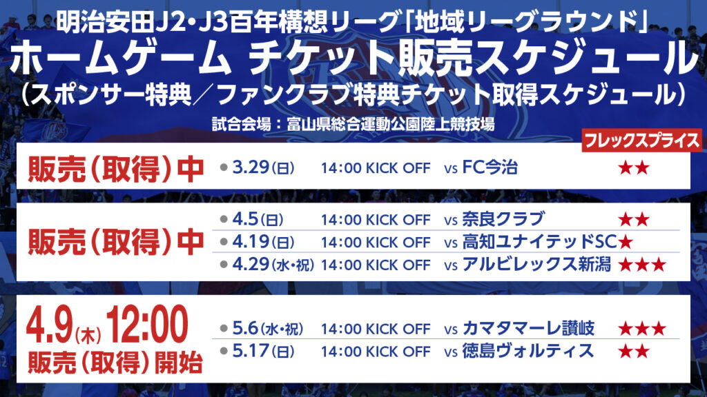 ※「明治安田Jリーグ百年構想リーグ&2026/27シーズン」カターレ富山ファンクラブ会員様向けに「回数券」、企業・団体様へ「法人回数券」をそれぞれ販売予定(対象席種:メインS自由、メインA自由、バック自由、ホームゴール裏自由)です。詳細は後日、お知らせします。