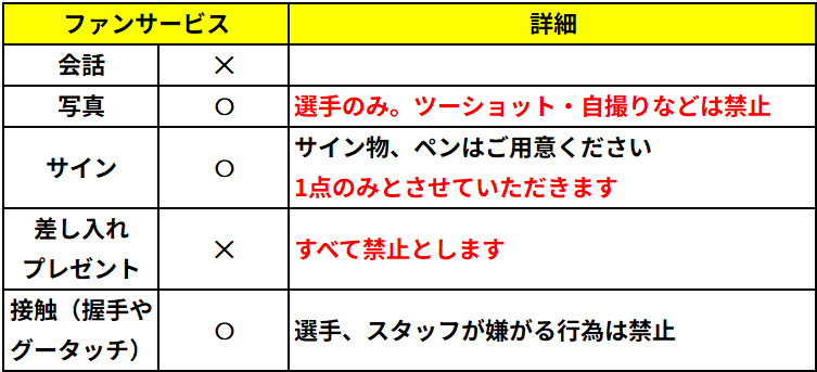 ・当日の気候や選手のコンディションにより、ファンサービスを中止する可能性もございますので予めご了承ください。