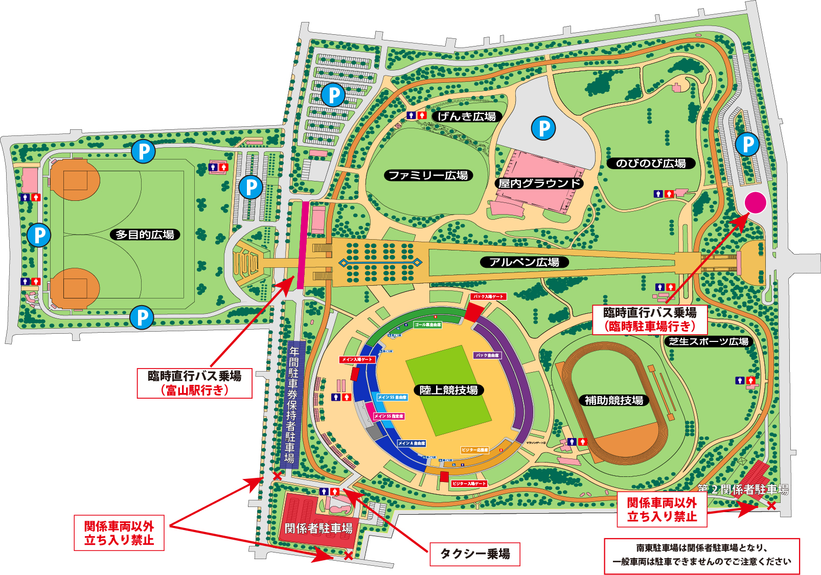 10月19日(日)、に開催される北海道コンサドーレ札幌戦(12:55キックオフ)においてスタジアム周辺の公共施設様のご協力のもと、無料臨時駐車場を設置いたします。ただし、駐車場には限りがございますので、富山駅からの「臨時バス」などの「公共交通機関」の利用や自家用車への乗り合わせなどご協力をお願いいたします。