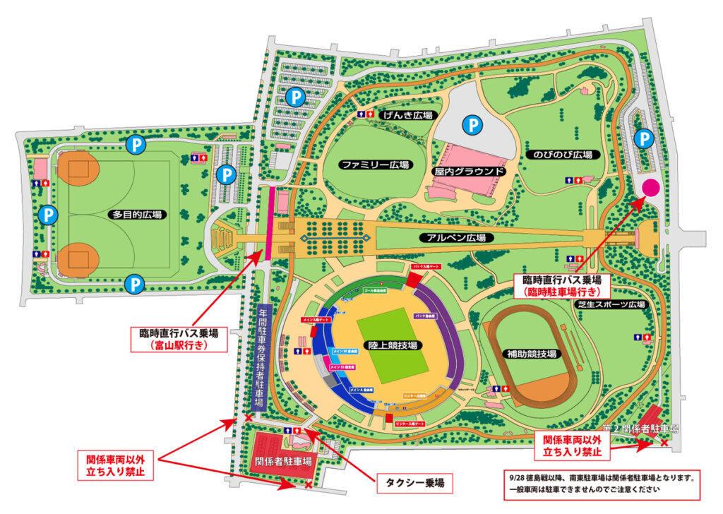 11月29日(土)ブラウブリッツ秋田戦においてスタジアム周辺の公共施設・企業様のご協力のもと、無料臨時駐車場を設置いたします。ただし、駐車場には限りがございますので、富山駅からの「臨時バス」などの「公共交通機関」の利用や自家用車への乗り合わせなどご協力をお願いいたします。