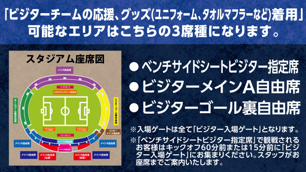 ※ビジターチームの応援グッズ(ユニフォーム、タオルマフラーなど)着用可能エリアは「ベンチサイドシートビジター指定席」「ビジターメインA自由席」「ビジターゴール裏自由席」の3席種とさせていただきます