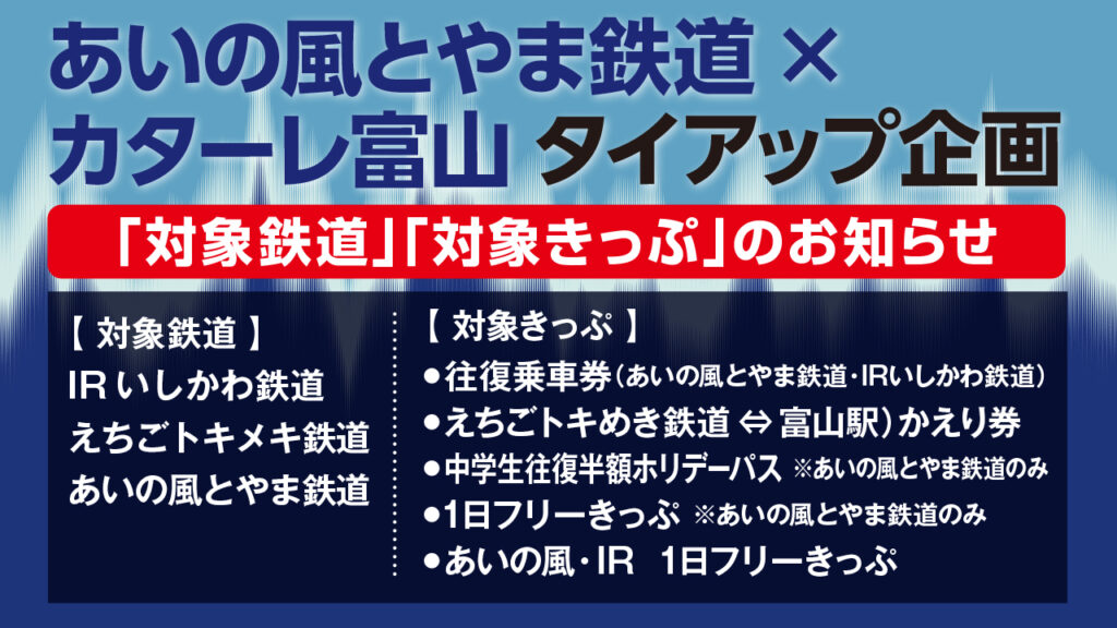 ご好評をいただいておりました「あいの風とやま鉄道×カターレ富山 タイアップ企画」当日券ご優待を今シーズンも継続実施いたします。ぜひ、あいの風とやま鉄道、IRいしかわ鉄道、えちごトキメキ鉄道に乗ってカターレ富山のホームゲームをお得に観戦してください!
