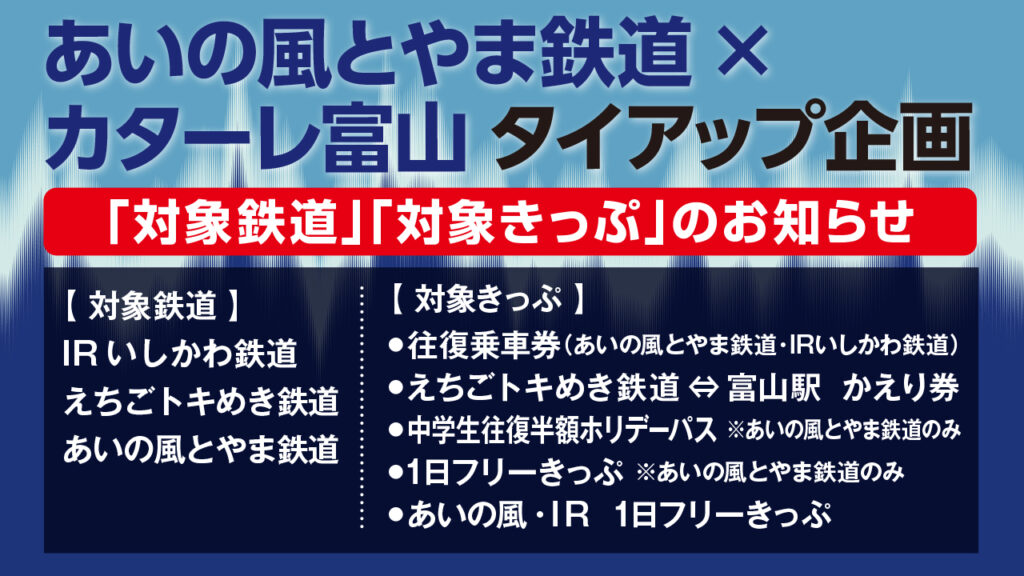ご好評をいただいておりました「あいの風とやま鉄道×カターレ富山 タイアップ企画」当日券ご優待を今シーズンも継続実施いたします。ぜひ、あいの風とやま鉄道、IRいしかわ鉄道、えちごトキめき鉄道に乗ってカターレ富山のホームゲームをお得に観戦してください!