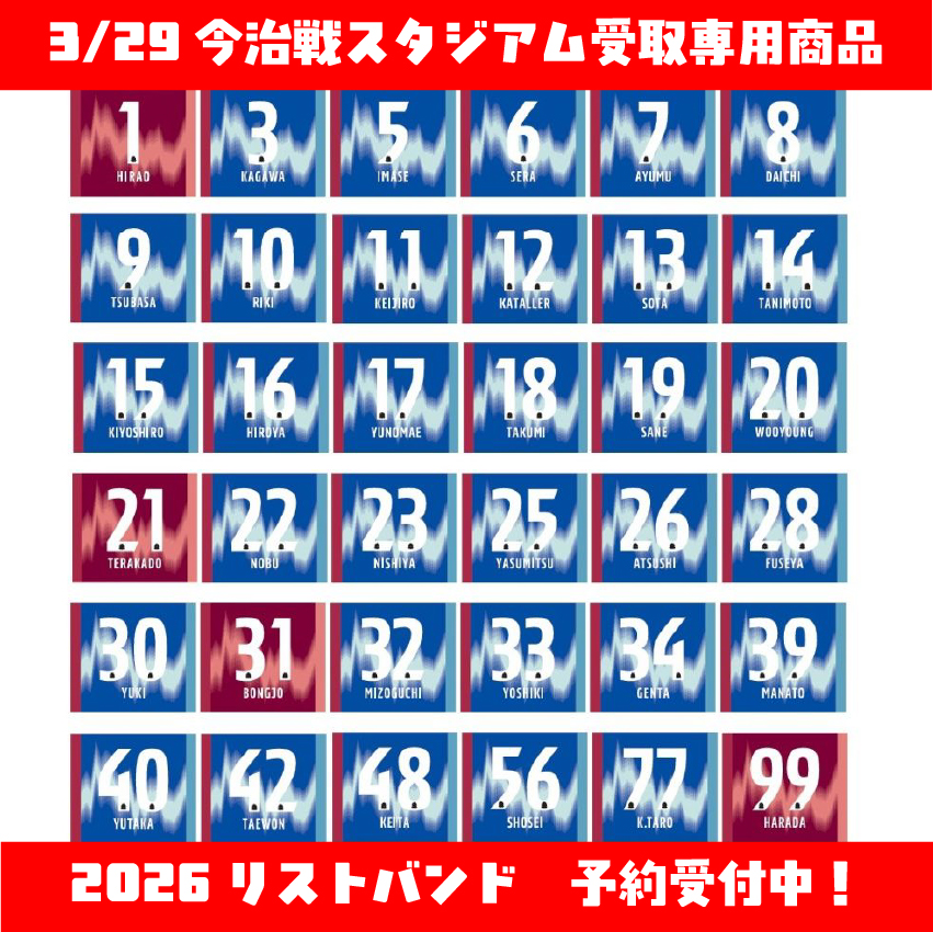 リストバンドは事前受付(スタジアム受け取り)で予約の入らなかった在庫のみ、陳列いたします。確実に手に入れたいかたは、まずはスタジアム受け取りにてオンラインストアよりご注文いただき、今治戦にてお受け取りをお願いいたします。