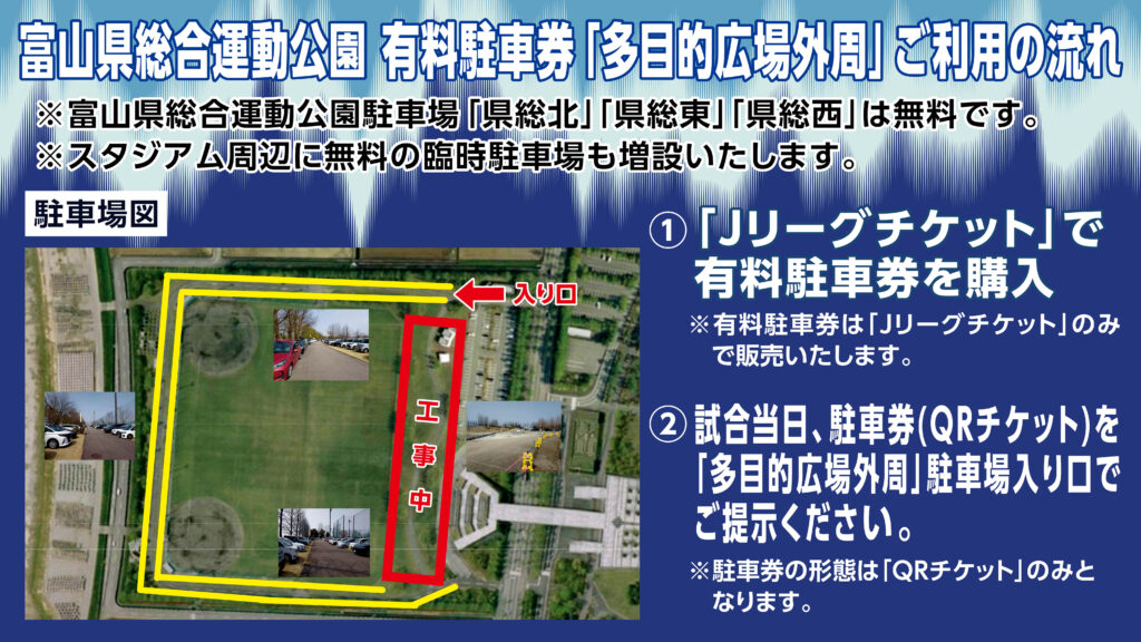 カターレ富山では大規模集客試合における受け入れ体制を継続的に見直し、臨時バス・臨時駐車場の増強や行政・警察との連携強化を図ってまいりました。新潟戦は、多くの来場者が見込まれることから、県総内の「多目的広場外周」を有料販売します。あわせて、無料の臨時駐車場を増設いたします。これにより、公園内への車両流入量を一定程度抑制し、周辺の臨時駐車場の利用を促すことで混雑緩和を図るとともに、お客様からいただいた駐車料金を原資に警備を充実させ、来場者や近隣住民の安心・安全を確保して参ります。