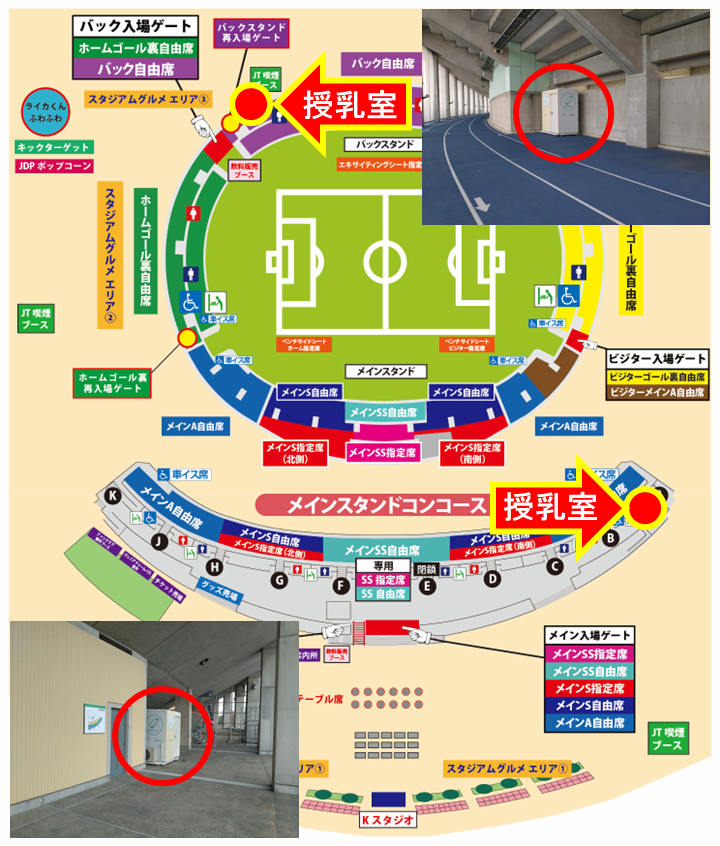 ・ホームゴール裏・ビジターゴール裏で観戦される方は近くのスタッフにお声がけください。近くの授乳室をご案内いたします。