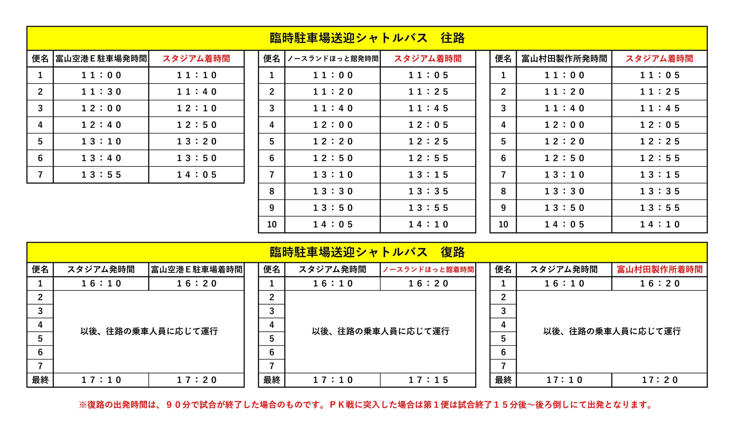 ※PK戦に突入の場合、第1便は試合終了15分後~第1便出発となります