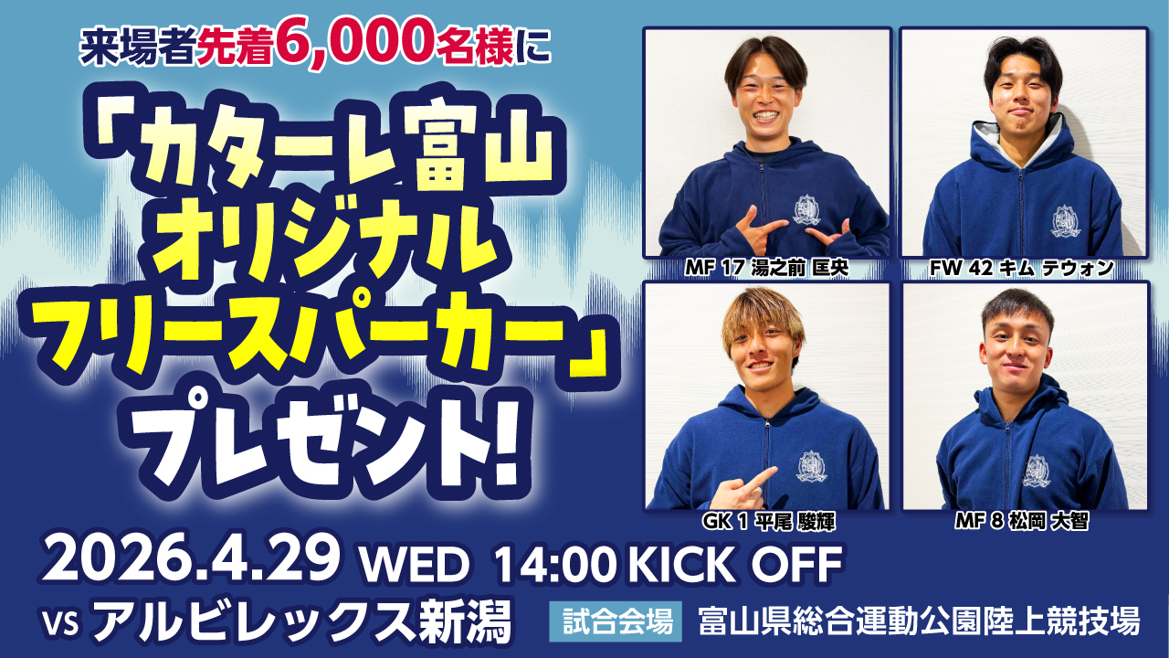 2026年4月~2027年3月の期間に富山県内の小学生が明治安田J2・J3百年構想リーグ「地域リーグラウンド」+2026/27シーズンにおけるカターレ富山ホームゲーム全試合を無料でご観戦できる招待企画「ジュニアドリームパス」を実施いたします。