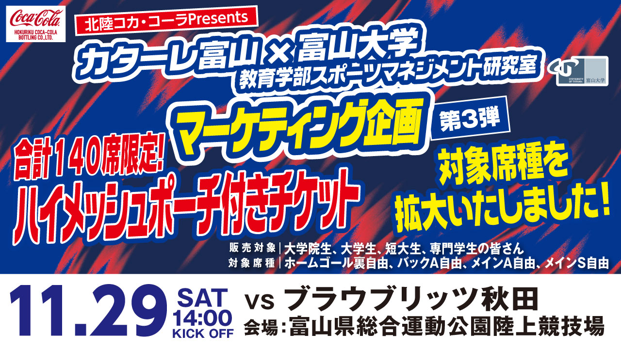 本企画チケットは若年層の集客に向けたマーケティング企画第3弾としまして、北陸コカ・コーラボトリング株式会社様のご協賛で、カターレ富山と富山大学教育学部スポーツマネジメント研究室(神野准教授)が引き続き、協働で取り組んで参ります。