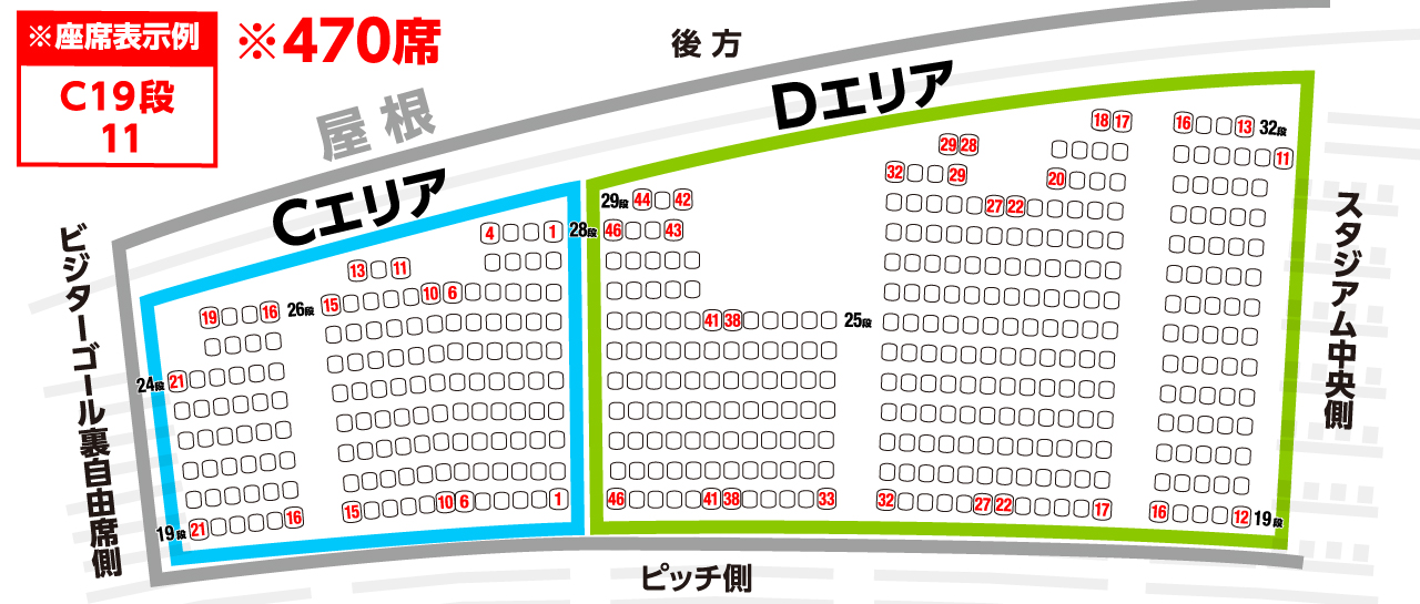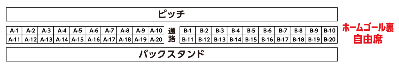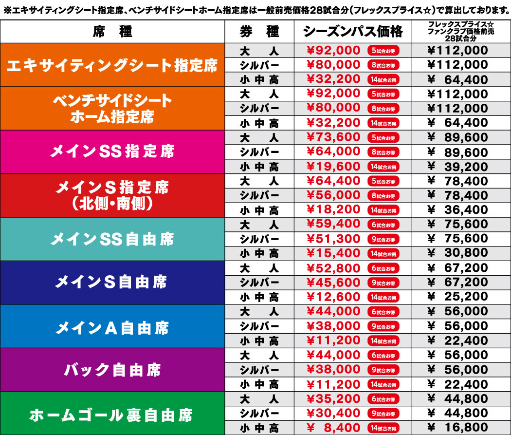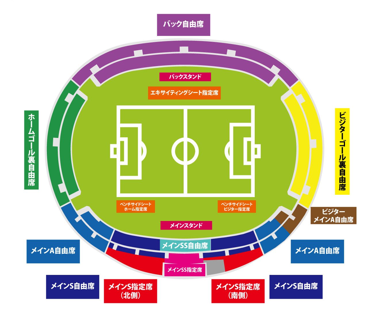 ・「指定席種」(エキサイティングシート、ベンチサイドシートホーム、メインSS指定、メインS指定北側・南側)、「自由席種」(メインSS自由、メインS自由、メインA自由、バック自由、ホームゴール裏自由)でそれぞれのリンクよりお手続きください。