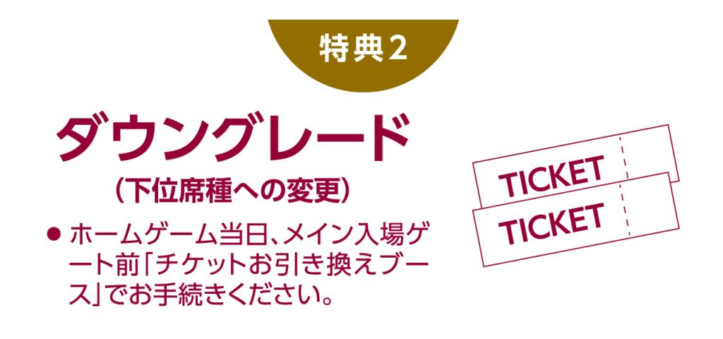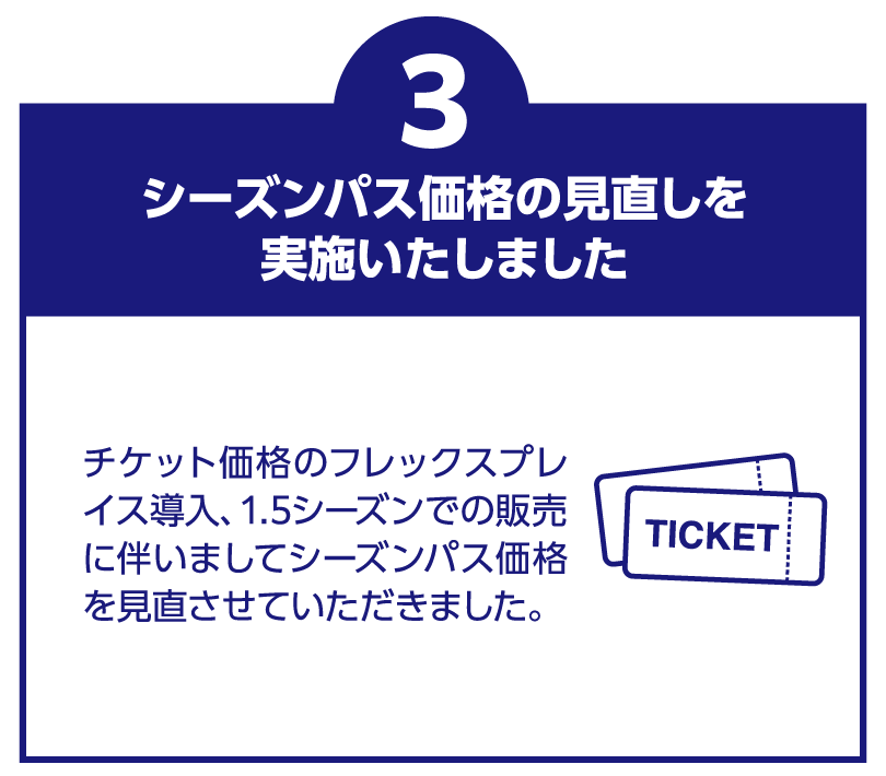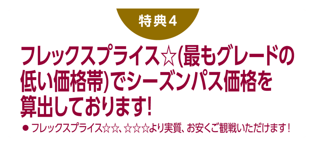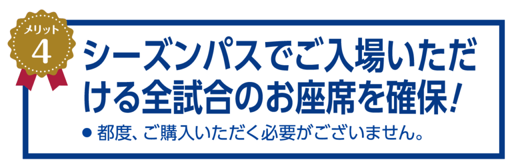 ・2025シーズンのシーズンパスで指定席種(エキサイティングシート指定、ベンチサイドシートホーム指定、メインSS指定)をご購入されていたお客様で「同じ座席(席番号も含みます)の継続購入」を希望される方は【2026年1月5日正午まで】に受付サイト「エキサイティングシート、ベンチサイドシートホーム、メインSS指定を昨シーズンと同じ座席をご希望の方はこちら」より、ご自身でお手続きください。