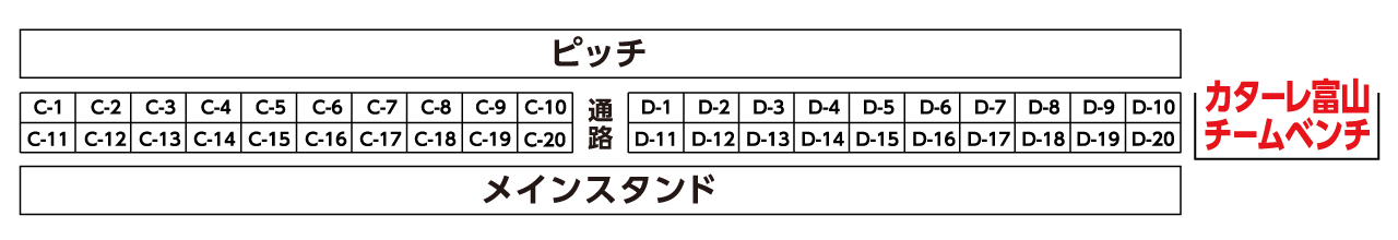 ・「メインSS指定席北側」がカターレ富山のホームゴール裏自由席に近いエリア、「メインS指定席南側」がビジターゴール裏自由席に近いエリアとなります。