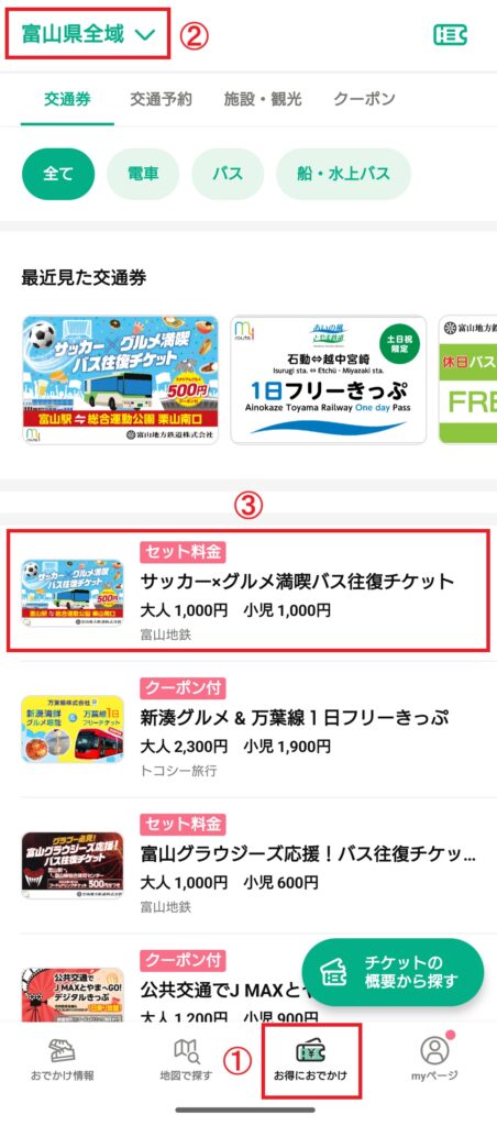 ・スマートフォンアプリ「my route」をインストールの上、「サッカー×グルメ満喫バス往復チケット」を購入ください。決済方法は、クレジットカードのほかPayPayが利用できます。