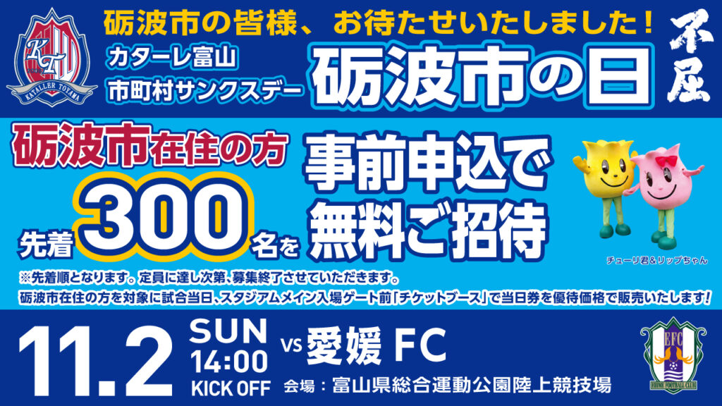 11月2日(日)愛媛FC戦を市町村サンクスデー「砺波市の日」としまして、砺波市在住のお客様先着300名を先着で無料招待いたします。また、試合当日はスタジアムメイン入場ゲート前「チケットブース」で砺波市在住の方を対象に当日券を優待価格で販売します。ぜひこの機会にご家族やご友人をお誘い合わせのうえ、カターレ富山のホームゲームにご来場ください!