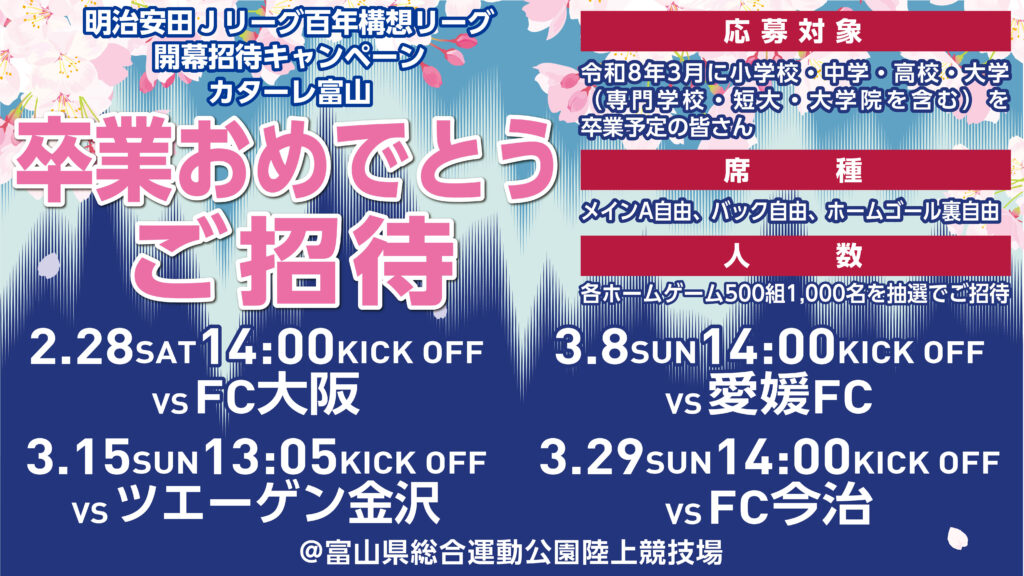 Jリーグでは、2026シーズンの開幕期に明治安田Jリーグ百年構想リーグの招待キャンペーンを実施いたします。カターレ富山は令和8年3月に小学校、中学、高校、大学(専門学校、短大、大学院も含まれます)を卒業予定の皆さんを2、3月のホームゲームに各試合500組1,000名を抽選で無料ご招待!ぜひ、スタジアムで楽しい思い出をつくってください!皆さんのご応募をお待ちしております!