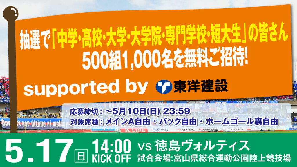 オフィシャルパートナーである東洋建設株式会社様のご協賛のもと、弊社SDGsの取り組みとして、5月17日(日)徳島ヴォルティス戦に「中学・高校・大学・大学院・専門学校・短大生」の皆さんを抽選で500組1,000名を無料ご招待します。ぜひ、学生の皆さんにはご友人をお誘いあわせのうえ、カターレ富山のホームゲームで楽しい時間をお過ごしください!