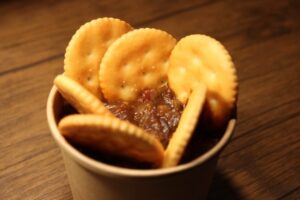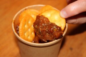 牛タンシチューにルヴァンクラッカーをトッピング。ザクザクとした食感と濃厚な牛タンシチューが相まって病みつきになります。
