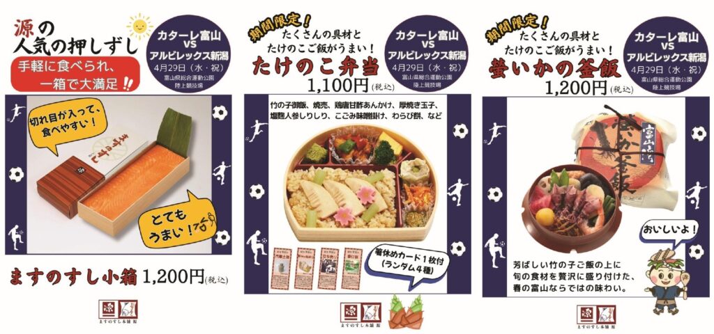 パートナー企業で、「ますのすし」でお馴染みの株式会社源 様より、2026年4月29日(水・祝)アルビレックス新潟戦に販売ブースを出店いただけることとなりました。