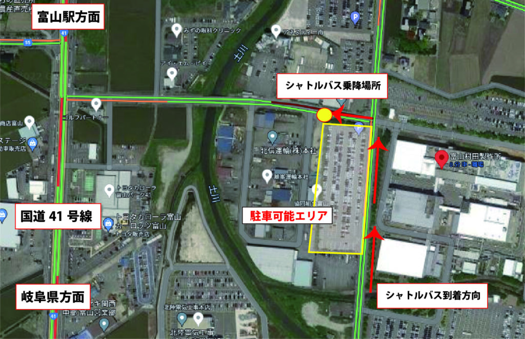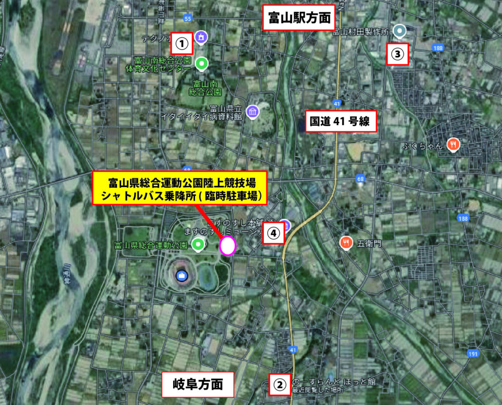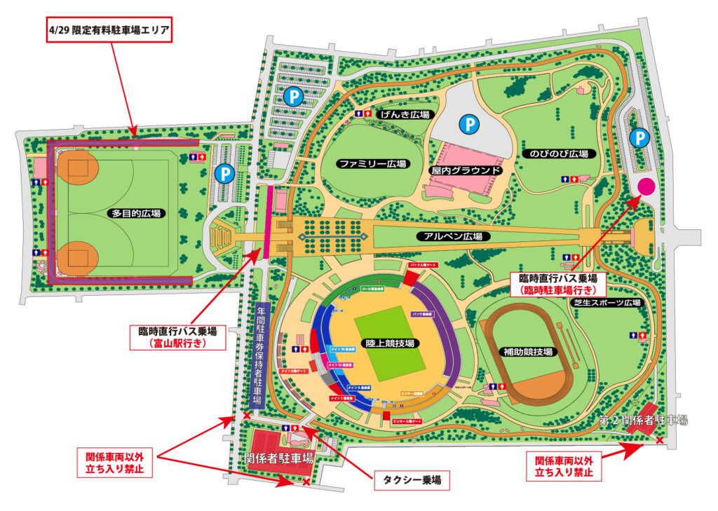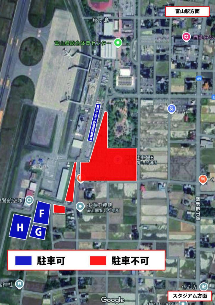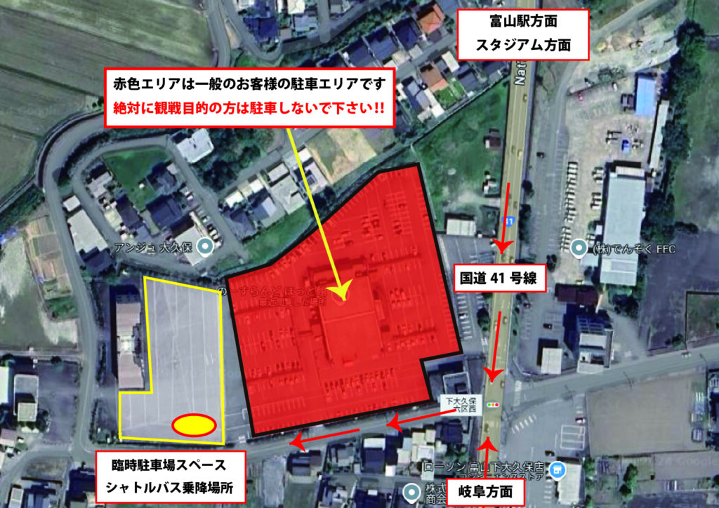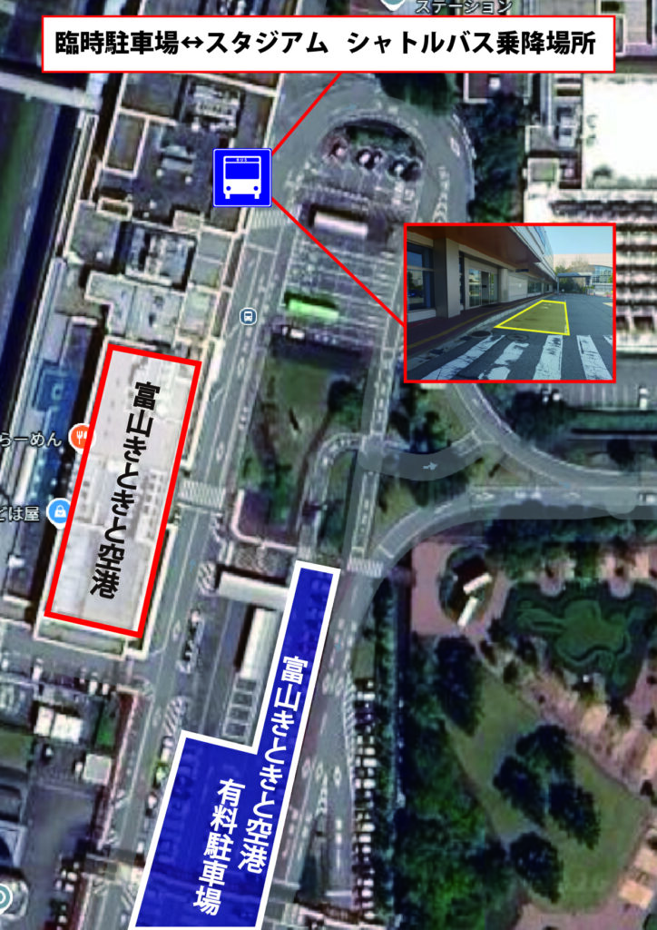 アルビレックス新潟戦においてスタジアム周辺の公共施設・企業様のご協力のもと、臨時駐車場を設置いたします。ただし、駐車場には限りがございますので、富山駅からの「臨時バス」などの「公共交通機関」の利用や自家用車への乗り合わせなどご協力をお願いいたします。