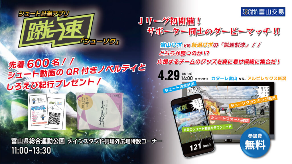 パートナー企業でもある、富山交易株式会社様より、2026年4月29日(水・祝)明治安田J2・J3百年構想リーグ第13節アルビレックス新潟戦に、シュート計測アプリ「蹴速 シューソク」計測コーナーを設置いただけることとなりました。設置場所は、メインスタンド側場外広場特設コーナーとなっております。