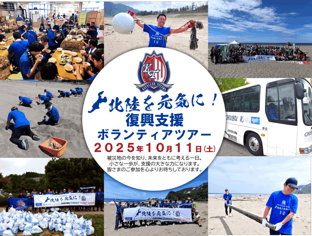 令和6年1月1日に発生した能登半島地震により、被災地では現在も復興に向けた懸命な取り組みが続いています。被災された皆さまに心よりお見舞い申し上げるとともに、一日でも早い復旧・復興を願い、私たちにできる支援の輪を広げ、カターレ富山ファンクラブ会員を対象に復興支援ボランティアツアーを実施いたします。