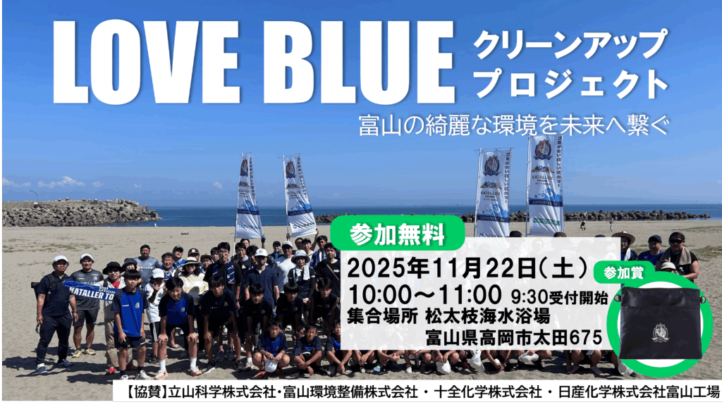 カターレ富山では企業や行政と連携し年間を通して街中や海岸などのごみ拾い活動を実施し、富山の綺麗な環境を未来へ繋いでいくプロジェクトを立ち上げました。
