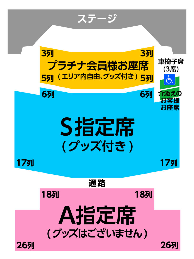 ・「プラチナ会員様対象エリア」「車いす席」「介添えのお客様 お座席」を除き、全席指定席となります。チケット券面に記載の座席番号に必ずご着席ください。