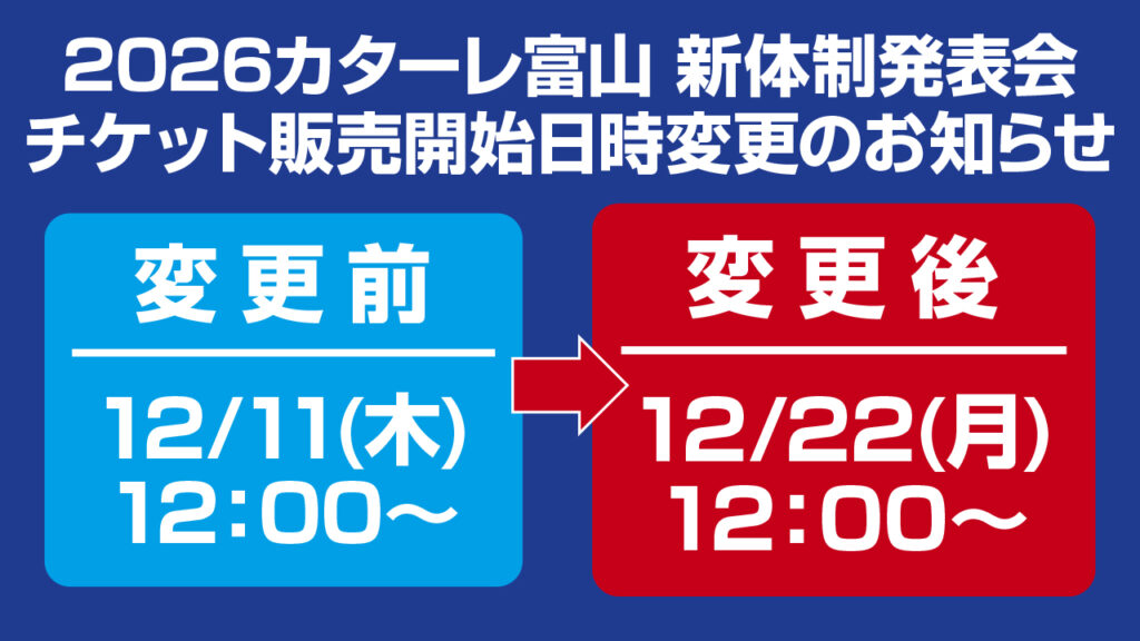 明治安田Jリーグ百年構想リーグ&2026/27シーズンのファンクラブ・シーズンパス受付開始日を12月18日(木)12:00~に変更に伴い「2026カターレ富山 新体制発表会」チケット販売開始日時を「12月22日(月)12:00~」とさせていただきます。チケット販売価格も含めまして、販売概要自体に変更はございません。お客様には大変ご迷惑をおかけいたしますが、何卒ご理解賜りますようお願い申し上げます。