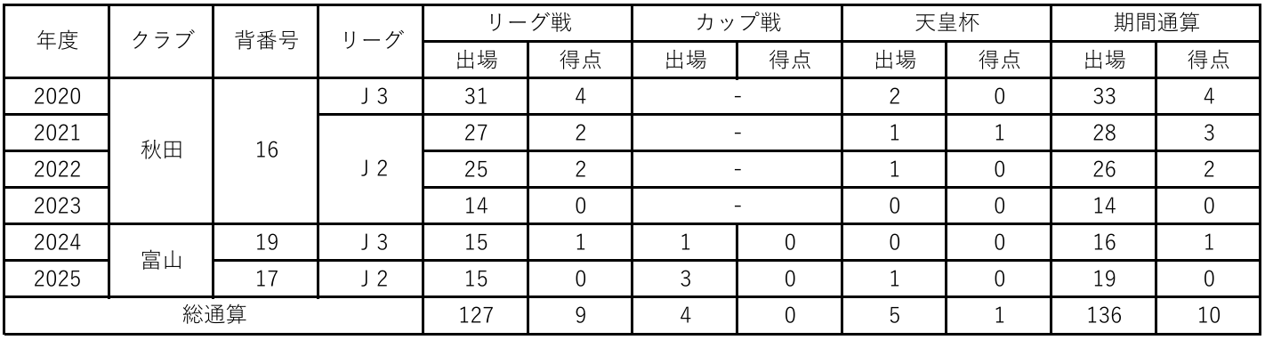 摂津イレブンJCS→レオSC→立正大淞南高→びわこ成蹊スポーツ大→ブラウブリッツ秋田→カターレ富山