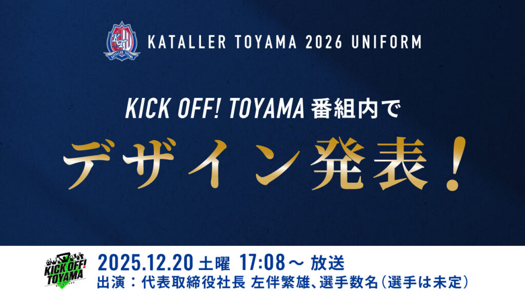 明治安田Jリーグ百年構想リーグ&2026/27シーズンユニフォームデザイン発表! 明治安田Jリーグ百年構想リーグおよび、2026/27シーズンに選手が纏うユニフォームデザインを下記の通り、12月20放送のチューリップテレビ「KICK OFF!TOYAMA」にて発表いたします。 明治安田Jリーグ百年構想リーグ&2026/27シーズンユニフォームデザイン発表! 日時:2025年12月20日(土)17:08~放送予定 媒体:KICK OFF!TOYAMA(チューリップテレビ) 出演:代表取締役社長 左伴繁雄、選手数名(選手は未定です)