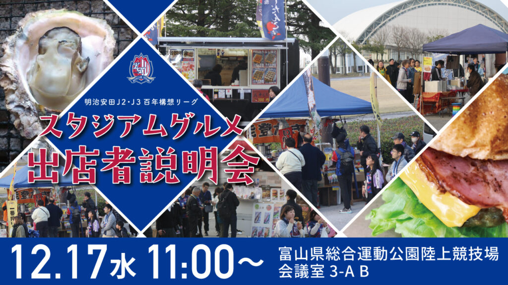 カターレ富山が目指す姿は「ここに住んでいて良かった」と思われる県民クラブ。ホームゲームでは『場内は真剣勝負、場外はお祭り』を合い言葉に、来場したすべてのお客様に非日常体験を提供し、富山を元気にするべく盛り上げていきます。スタジアムグルメの充実は場外をお祭りにする為に必要不可欠な要素です。カターレ富山と共に『食』から富山を元気にしていただける熱い想いを持った飲食店の皆様を募集いたします。以下の日程にて「明治安田J2・J3百年構想リーグ スタジアムグルメ出店者説明会」を開催いたしますので、これまでご出店いただいた方も、新しくご出店をお考えの方も、ぜひご参加ください。