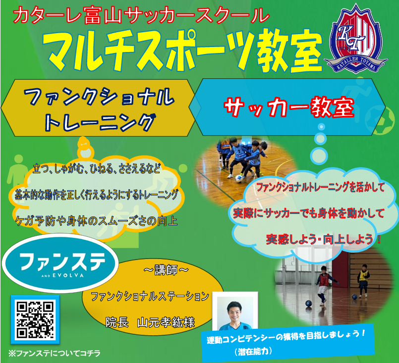 カターレ富山サッカースクールによるサッカー教室と、さまざまなスポーツ・トレーニングとのコラボ企画を実施します。今回は「ファンクショナルトレーニング」とのコラボイベントです。ファンクショナルトレーニングとは、立つ・しゃがむ・ひねる・支えるといった基本的な動作を、正しく行えるようにするトレーニングです。このトレーニングを取り入れることで、サッカーの動きはもちろん、日常生活での動作もよりスムーズになり、ケガの予防にもつながります。サッカー教室では、ファンクショナルトレーニングで学んだ動きを活かしながら、実際にサッカーを通して身体を動かし、プレーの中で変化や成長を実感していただきます。