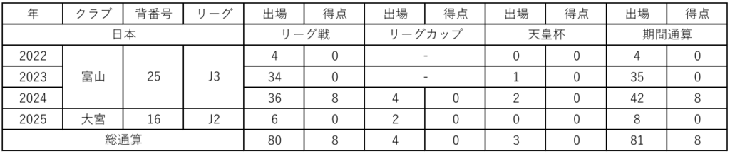 ■経歴 : ジェフユナイテッド市原・千葉U-15→ジェフユナイテッド市原・千葉U-18→法政大学→カターレ富山→RB大宮アルディージャ