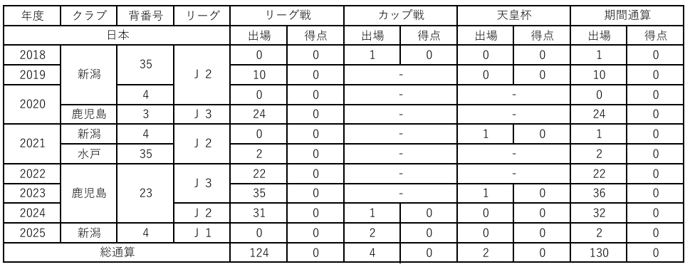 ■経歴 : TOHRI SC→アルビレックス新潟U-15→アルビレックス新潟U-18→アルビレックス新潟→⿅児島ユナイテッドFC→アルビレックス新潟→⽔⼾ホーリーホック→⿅児島ユナイテッドFC→アルビレックス新潟