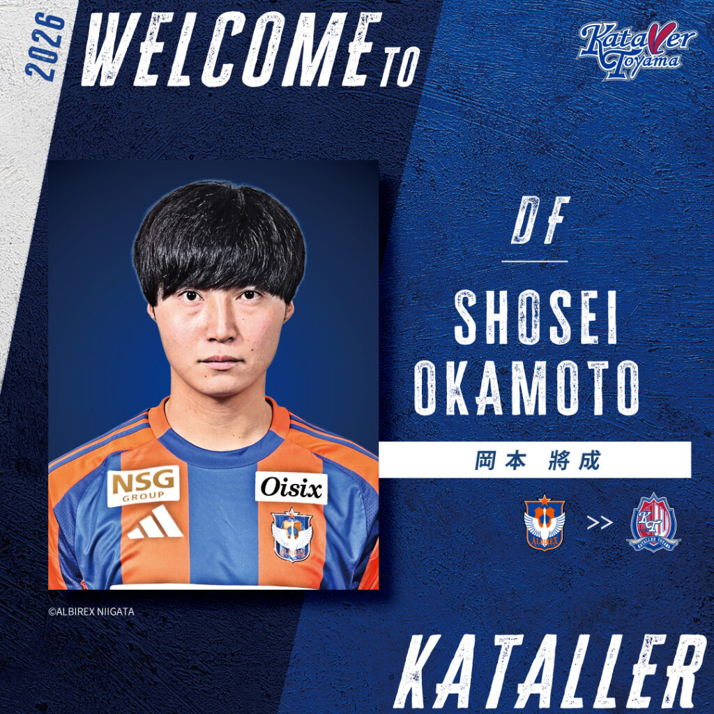 このたび、カターレ富山にアルビレックス新潟の岡本將成選手が明治安田Jリーグ百年構想リーグならびに2026/27シーズンより完全移籍で加入することが決定いたしましたので、お知らせいたします。