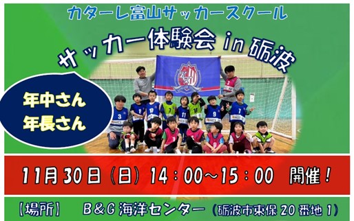 『カターレ富山サッカースクール 年中さん・年長さんサッカー体験会 in 砺波』を開催することとなりましたのでお知らせいたします。