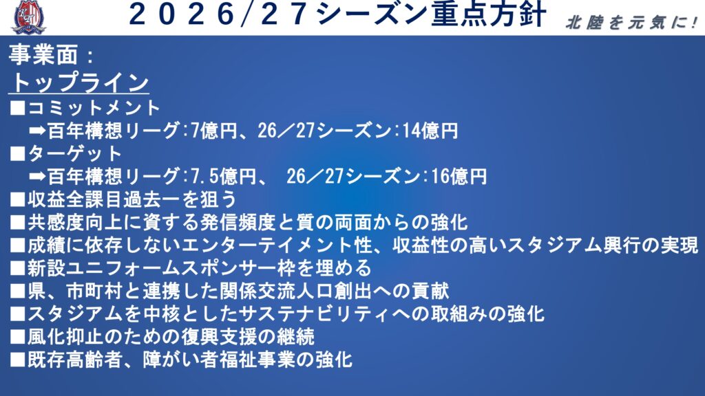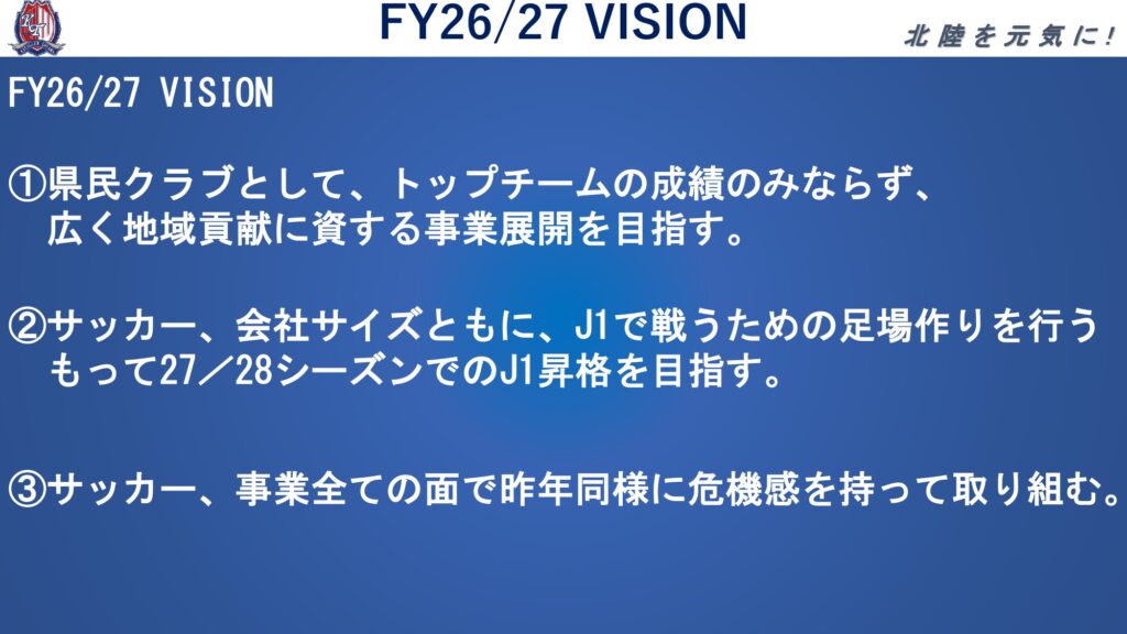 このたび、カターレ富山では、2026/27シーズンの会社ビジョンや事業方針をまとめた「カターレ富山VISION26/27」とビジョン実現に向けたキーメッセージ「26/27シーズン クラブスローガン」が決定いたしましたので、下記のとおりお知らせいたします。