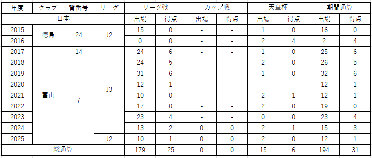 ■経歴:新庄スポーツ少年団→富山北FC→FC東京U-18→東京学芸大→徳島ヴォルティス→カターレ富山