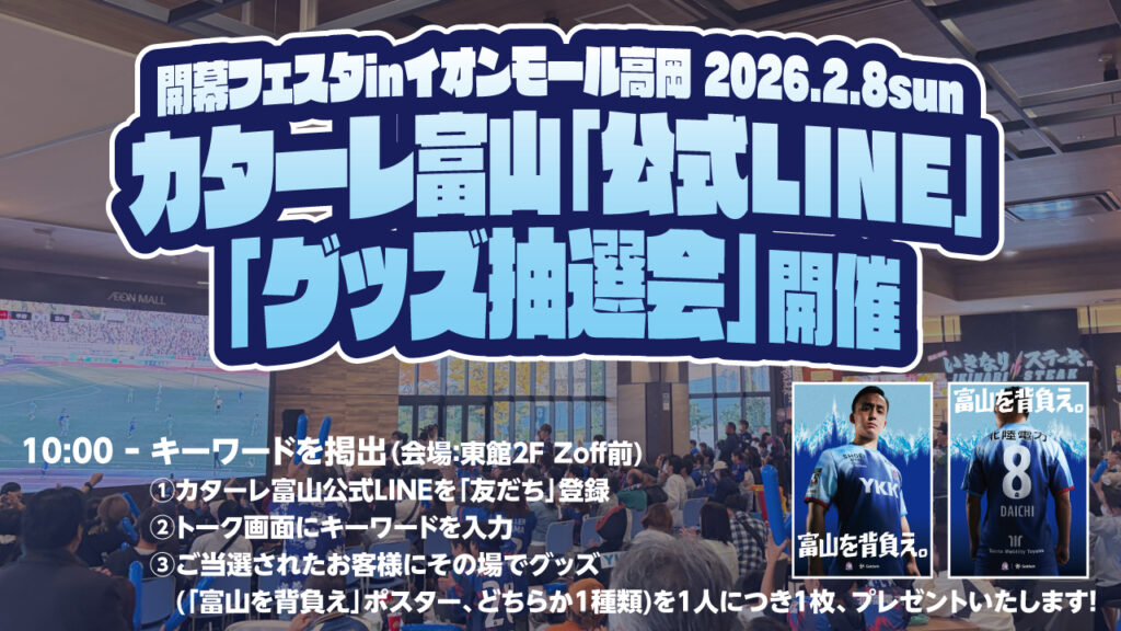イオンホール高岡で開催する「開幕フェスタ」でカターレ富山「公式LINE」グッズ抽選会を開催いたします。是非、ご参加ください!
