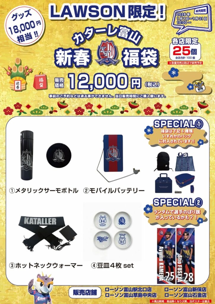 富山県内にあるローソン4店舗にて「LAWSON限定カターレ富山新春福袋」を販売することとなりましたのでお知らせいたします。ぜひこの機会にお買い求めください。