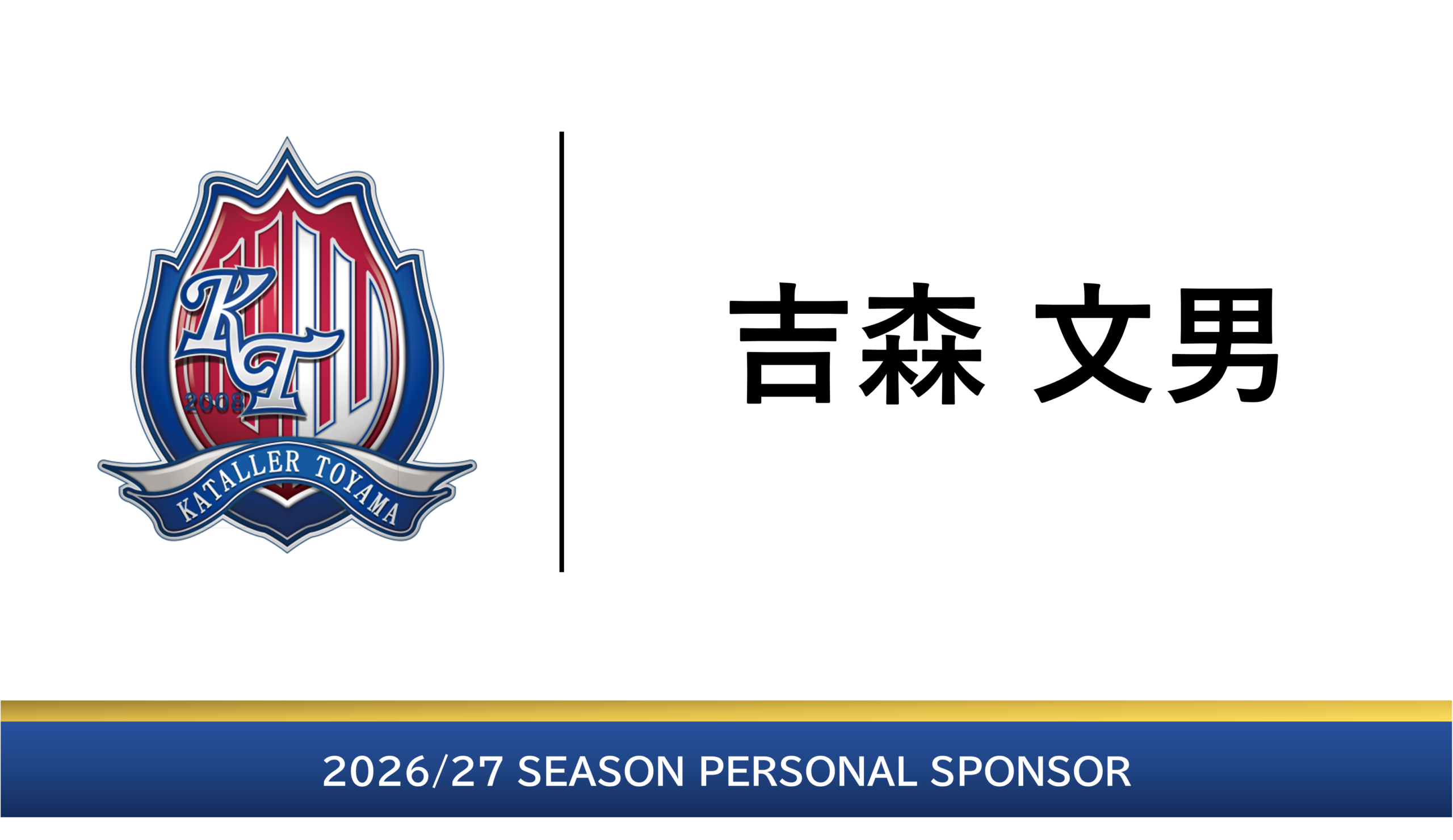 2026/27個人スポンサー 応援メッセージ vol.2 カターレ富山は、吉森 文男 様と2026/27シーズン 個人スポンサーの契約を締結しご支援いただくこととなりましたので、下記の通りお知らせいたします。 契約締結に関するコメント(応援メッセージ) カターレ富山でプレーしてくださりありがとうございます。うれしい結果だけでなく、一生懸命のプレイが実らず残念な結果となることもありますが、それも含めてワクワク、ドキドキさせてもらっています。カターレでの練習、プレーで選手として成長し、結果として良かったと思ってもらえるよう、これからも応援しています。