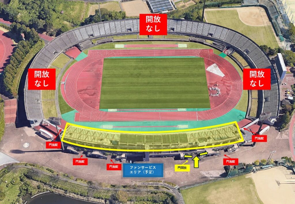 メインスタンド、黄色のエリアでの見学をお願いいたします。