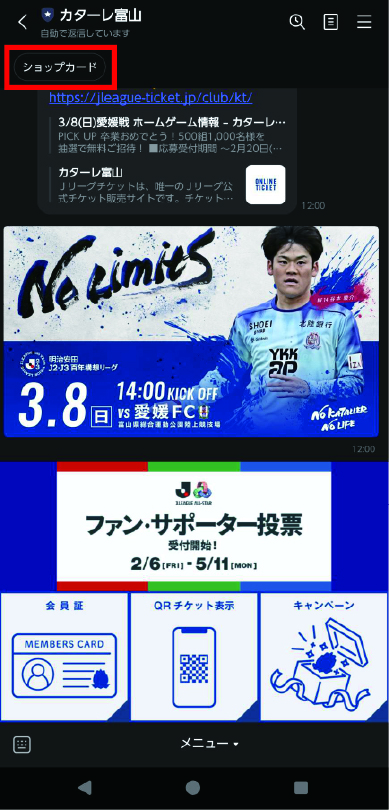 ②トーク画面を開き、ページ上部にあるショップカードをタッチして下さい